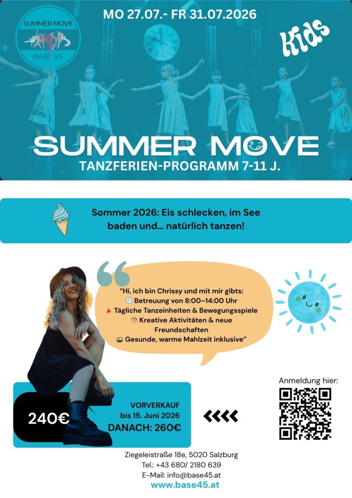 Von Montag bis Freitag jeweils von 8-14 Uhr laden wir tanzbegeisterte Kinder in Salzburg und Umgebung ein, sich gemeinsam mit unserer Trainerin Chrissy zu bewegen, coole einfache Choreografien zu erlernen, Tanzspiele zu spielen und dabei neue Freundschaften zu knüpfen.