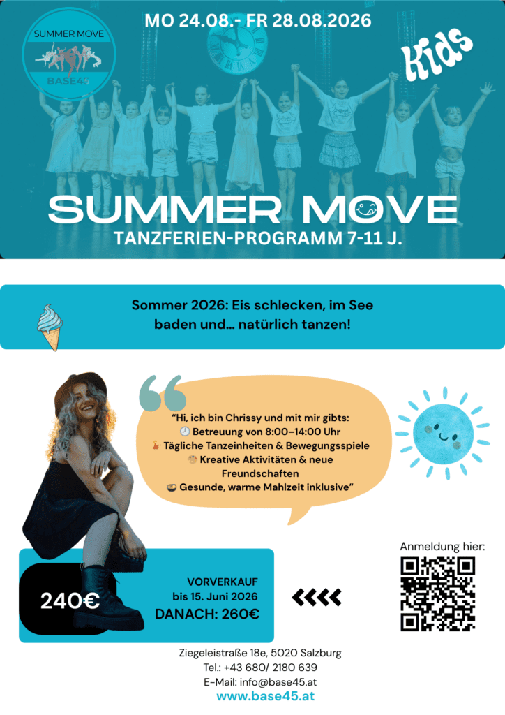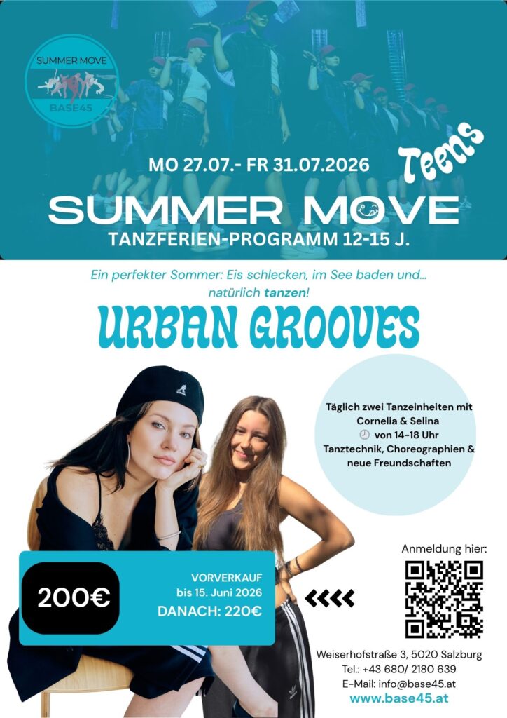 Von Montag bis Freitag jeweils von 14-18 Uhr laden wir tanzbegeisterte Teens in Salzburg und Umgebung ein, sich gemeinsam mit unseren Trainerinnen zu bewegen, coole urbane Choreografien zu erlernen und eine tolle, bewegte Zeit im Sommer 2026 zu verbringen.